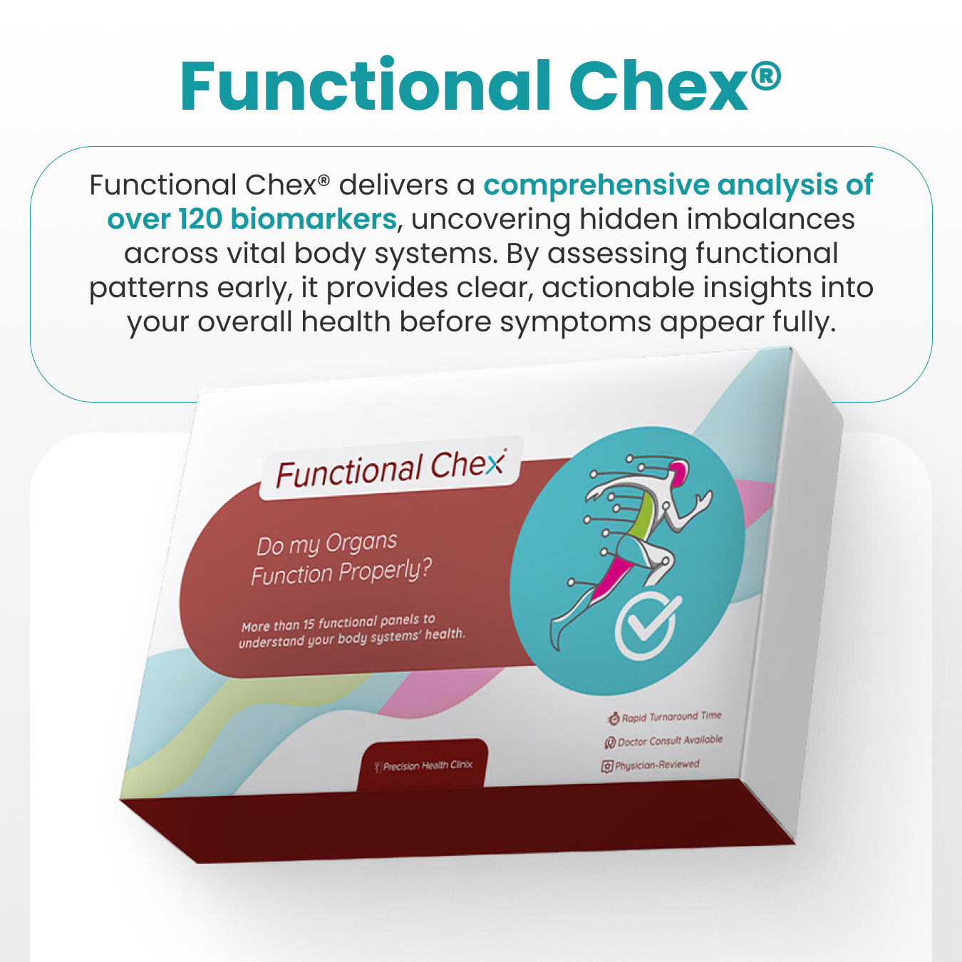 Functional Chex analyzes over 120 essential biomarkers related to metabolism, hormones, nutrient levels, inflammation, immunity, thyroid, cardiovascular, and more. It provides a comprehensive overview of how your body is functioning at a systemic level—so you can detect imbalances before they turn into long-term issues.